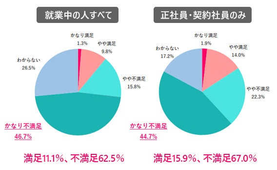 雇用形態が「正社員・契約社員」の人だけで見てみると、「かなり不満足」「やや不満足」の不満足派は67.0%でした。「かなり満足」「やや満足」を選んだ人は15.9%とこちらも少ない結果でした。