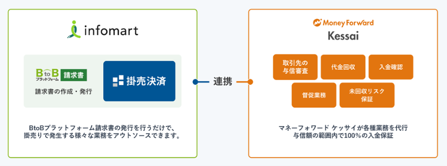 「掛売決済」は、当社が提供する「BtoBプラットフォーム 請求書」とMFKが提供する「マネーフォワード ケッサイ」を連携し、取引先の与信審査や請求書発行後の代金回収、入金確認・消込、未入金時の取引先への連絡等の一連の業務をMFKにアウトソースできるサービスです。(※1)
