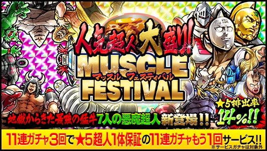 また、バトルのクリアターン数を競い合う超人BATTLELIMITの期間限定ミニバージョンである「超人PURIPU・LIMIT」や、集結した7人の悪魔超人が登場する「人気超人大盛り!マッスルフェスティバル」など、様々なイベントやキャンペーンを開催いたします。