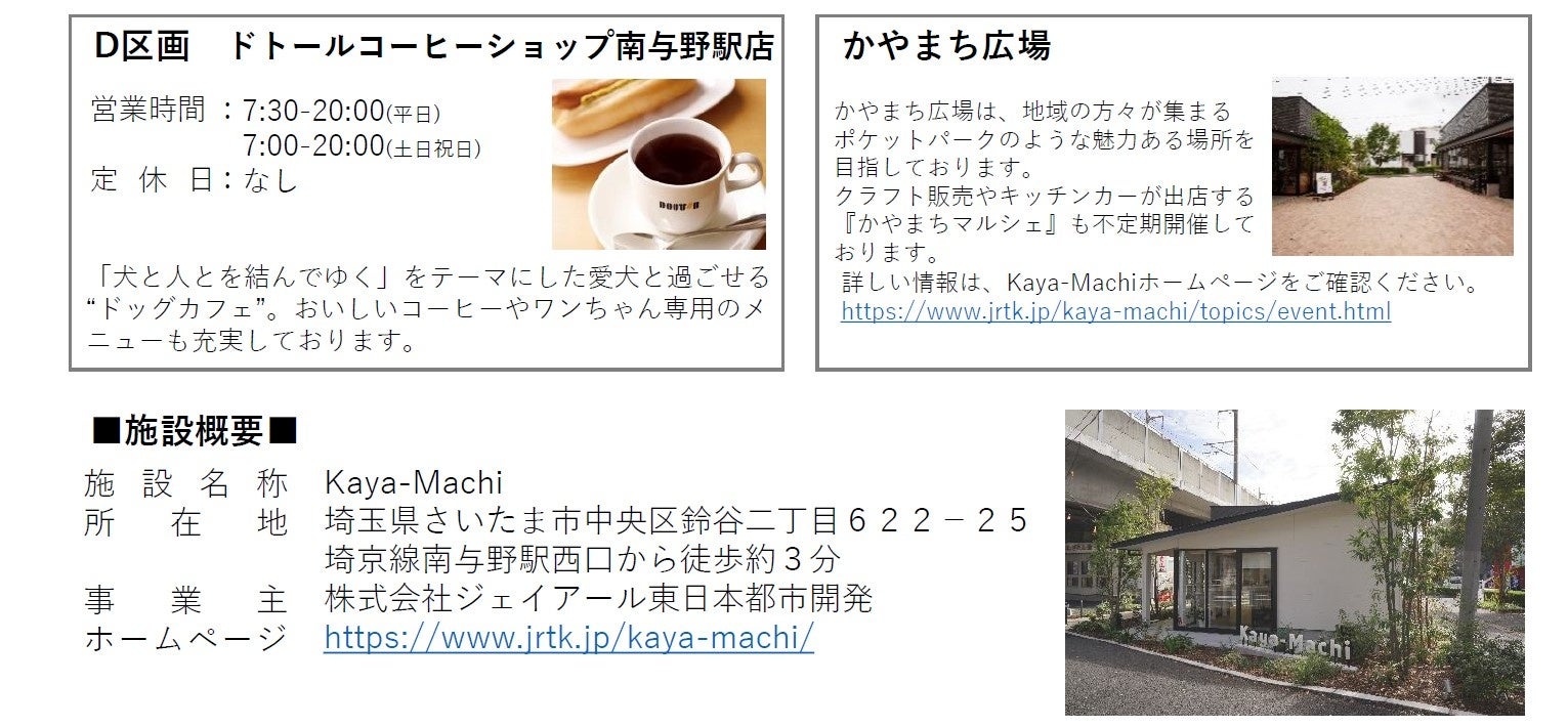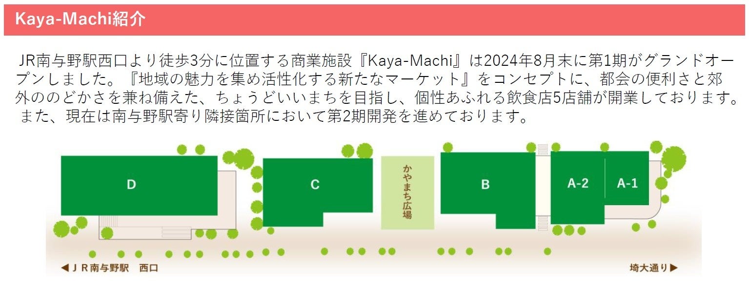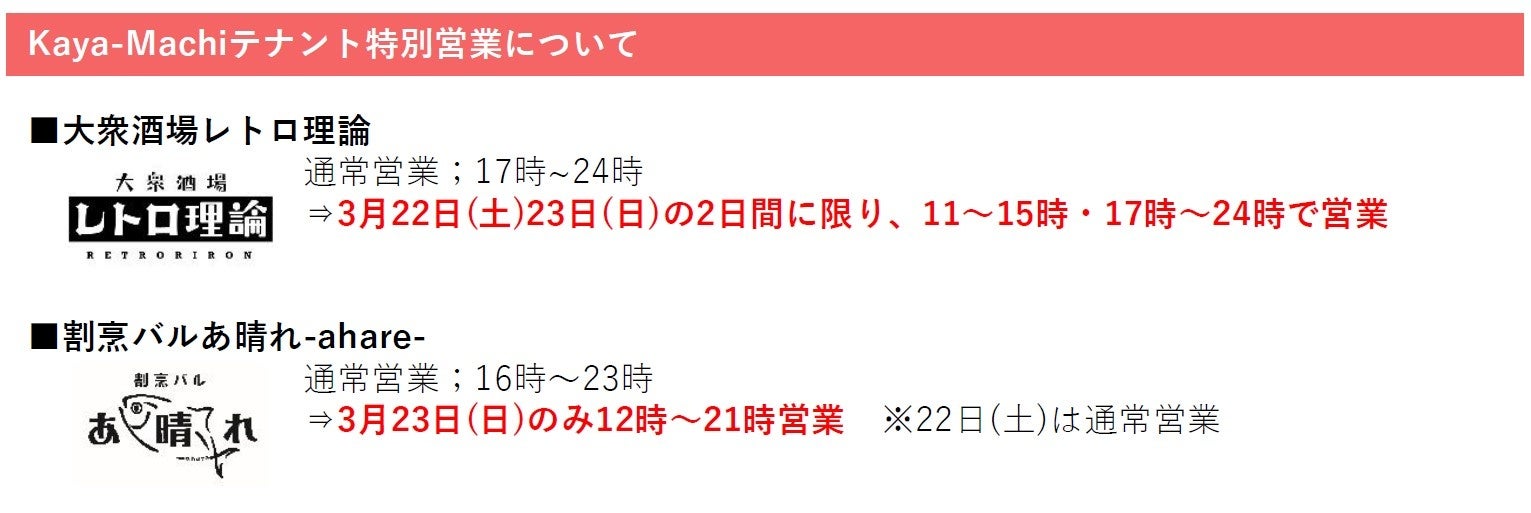 また、2024年8月末にグランドオープンした商業施設「Kaya-Machi」とも連携し、第2会場として「かやまち広場」にクラフト販売を中心とした店舗が出店します。「Kaya-Machi」の一部店舗においても特別営業時間を設けるなど、地域の方とつながる賑わいのある場所を提供します。