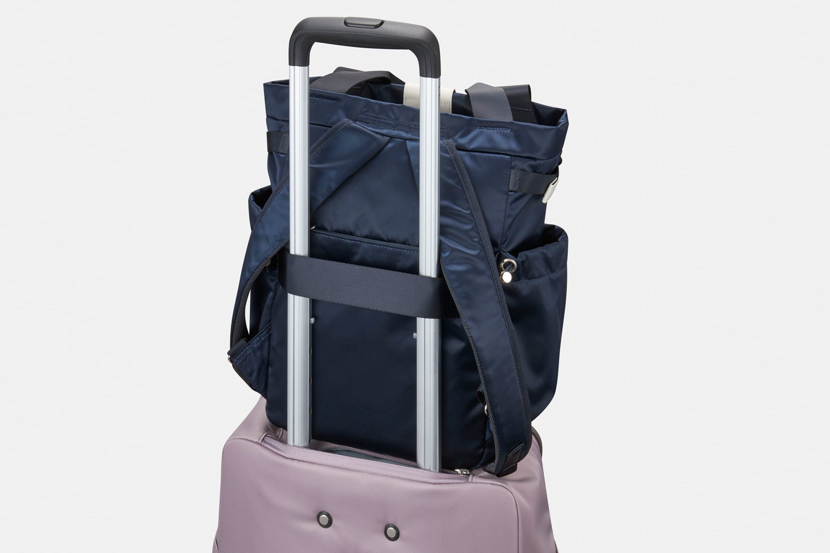 キャリーケースのプルドライブハンドルに差し込んでバッグを固定できるセットアップベルトが付いています。