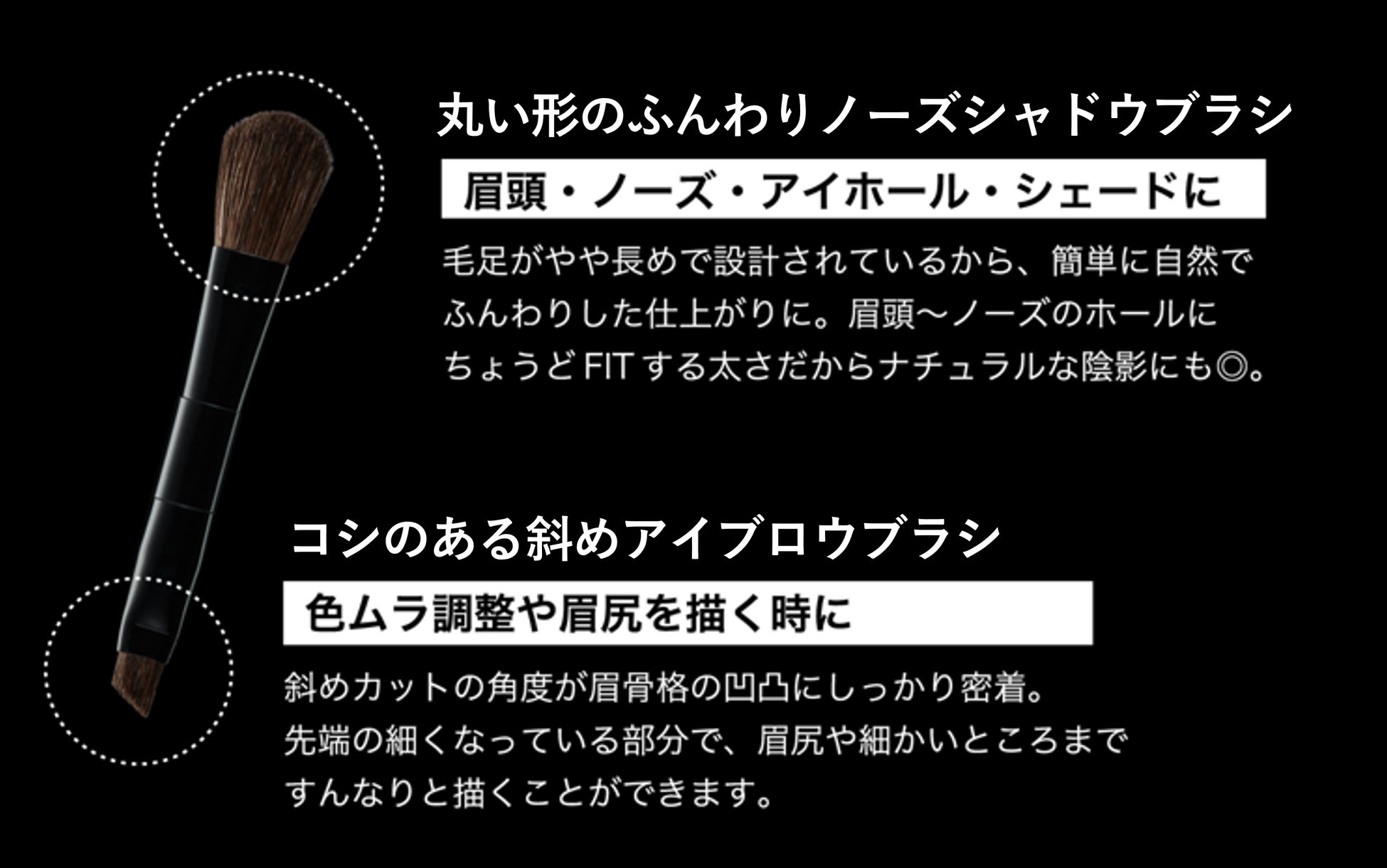 ●手振れしにくく、用途多様な付属ブラシ。特にアイブロウブラシは、