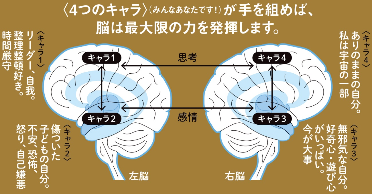 自分の中の〈4つのキャラ〉を識別することができるようになり、それぞれのキャラを等しく評価し、大切にできるようになれば、意識的かつ意図的に自分がどのような人間でありたいか選択ができるようになります。最終目標は、〈4つのキャラ〉がお互いに理解し合って、健全な関係を築くこと。そうすれば、〈キャラたち〉は自分自身の天賦の才を最大限に活かした健全なチームとして、集団で機能するようになります。