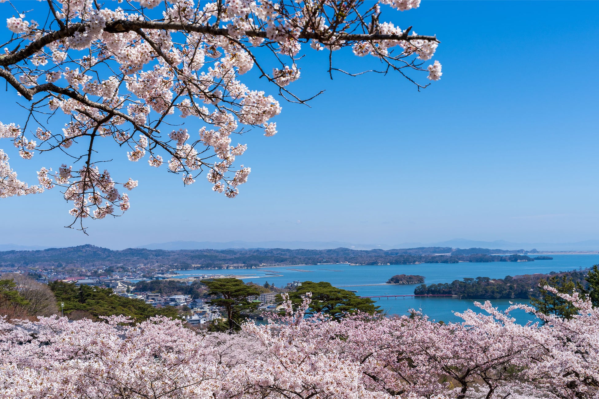 松島湾と桜を一望に収めることができる絶景スポット。タイミングがよければ遊覧船が横切る絵葉書のような風景が見られます。