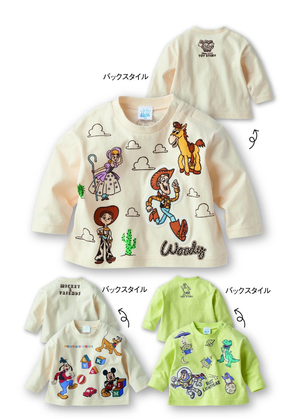 トイ・ストーリーのおもちゃたちやディズニーのネコがデザインされた長袖Tシャツ。