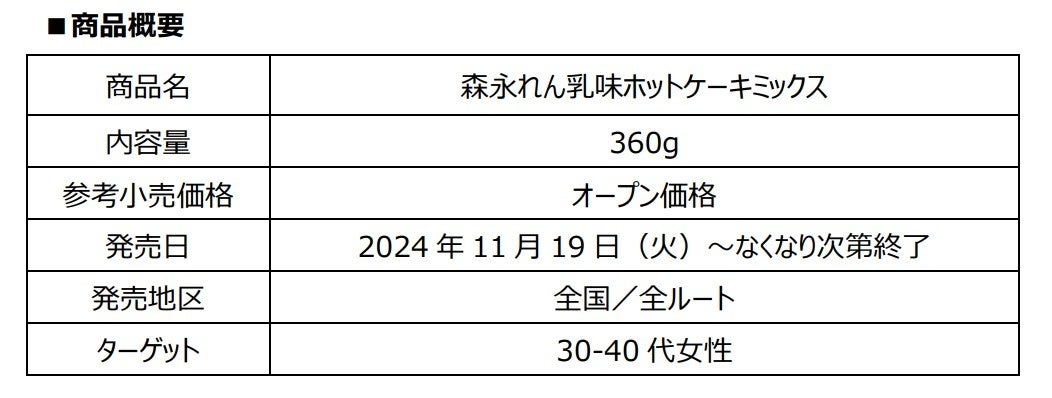森永製菓株式会社(東京都港区芝浦、代表取締役社長・太田 栄二郎)は、森永乳業株式会社(東京都港区東新橋、代表取締役社長・大貫 陽一)の人気商品「森永ミルク 加糖れん乳」とコラボレーションした「森永れん乳味ホットケーキミックス」を2024年11月19日(火)より期間限定で新発売いたします。コクのある「森永ミルク 加糖れん乳」の味わいをイメージしたホットケーキを牛乳だけで作ることができます。さらに、いちごやれん乳をトッピングすることで至福のひとときを楽しむことができます。森永製菓、森永乳業の人気商品同士のコラボレーションにより実現した「森永れん乳味ホットケーキミックス」の発売で、おいしさと話題性で需要を喚起し、お客様に笑顔をお届けしてまいります。