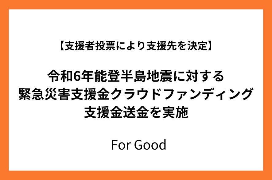 For Good、令和6年能登半島地震に対する緊急支援プロジェクトの支援先を支援者投票にて決定し、14の活動団体に送金を実施