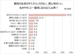 反対に、ストレスがなく居心地がいい、生きやすいと一番感じるのはどんな時かも質問しました。結果「自宅でリラックスしているとき(44.2%)」に4割以上の票が集まりました。居心地よく過ごすためには、自宅での時間が重要だと考えられます。次いで「趣味に没頭しているとき(11.4%)」という回答が続きました。
