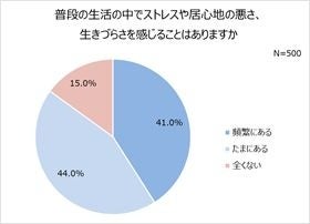 そこで、現代の女性が自分らしくいられる“生きごこち”について、全国の20~40代の働く女性500名を対象に調査を実施。その結果、普段の生活の中でストレスや居心地の悪さ、生きづらさを感じている女性は85%もいることが明らかになりました。