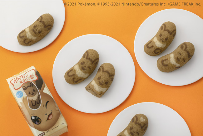 【特 徴】もふもふしたイーブイみたいに柔らかなチョコ風味のスポンジケーキから、“キャラメルマキアート味のバナナカスタードクリーム”がとろけます。「れいとう」するとアイスにしんか!?するから、ぜひ試してみて。ほかにも、フレンチトースト風にしたり焼いてみたり、いろんな“しんか”の可能性を秘めているかも…!?