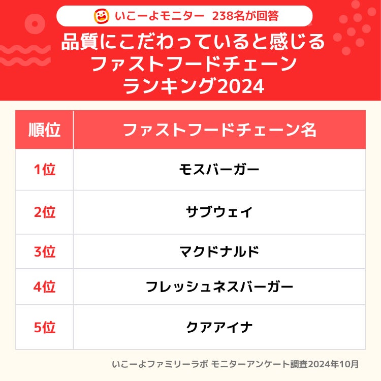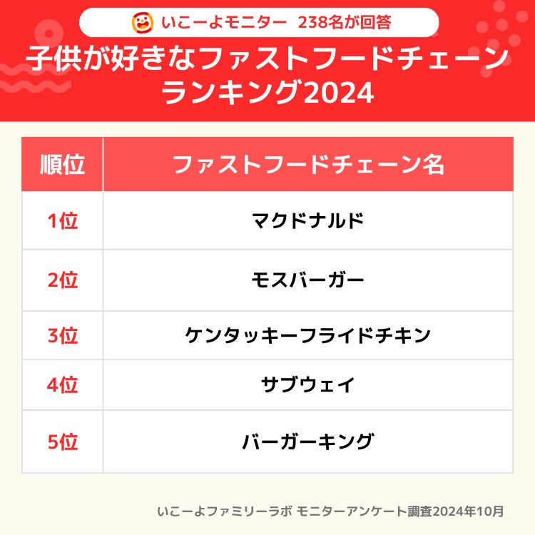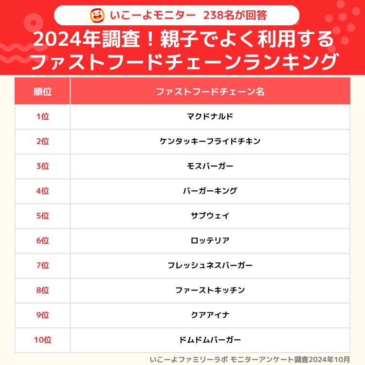国内最大級の子供とお出かけ情報サイト「いこーよ」を運営するアクトインディ株式会社(東京都港区 代表取締役:下元敬道、以下「アクトインディ」)は、「いこーよファミリーラボ」にて、「親子で利用する『ファストフードチェーン』ランキング」をテーマに、ファストフードチェーンについて多彩な視点からランキング調査を行いました。