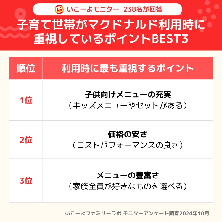 マクドナルドが子育て世帯に利用されている理由を聞いたところ、1位は「子供向けメニューの充実」をあげる声が最も多くあげられました。