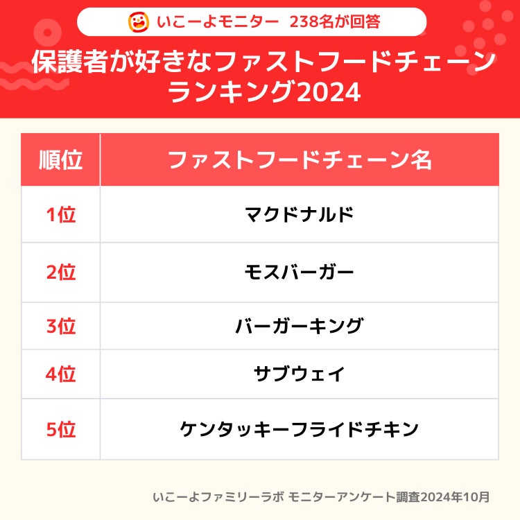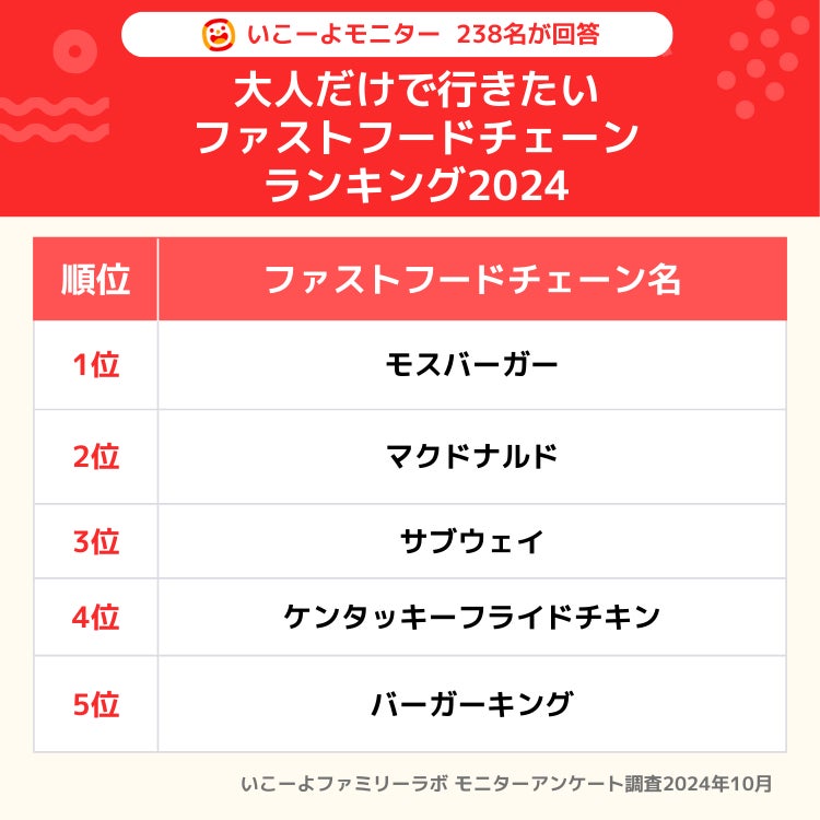 「親子でよく利用するファストフードチェーンランキング」1位は「マクドナルド」! 大人だけで行きたいファストフードチェーン1位は「〇〇バーガー」/いこーよファミリーラボ