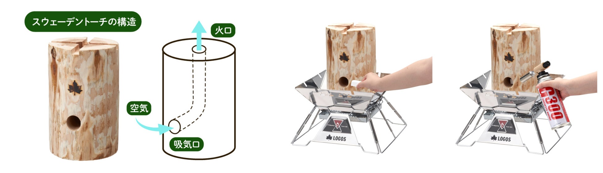 丸太に直接火をつけてたき火が楽しめるほか、様々なシーンで使える「LOGOS スウェーデントーチ」を、これからの季節のアウトドアライフにぜひともご活用ください。