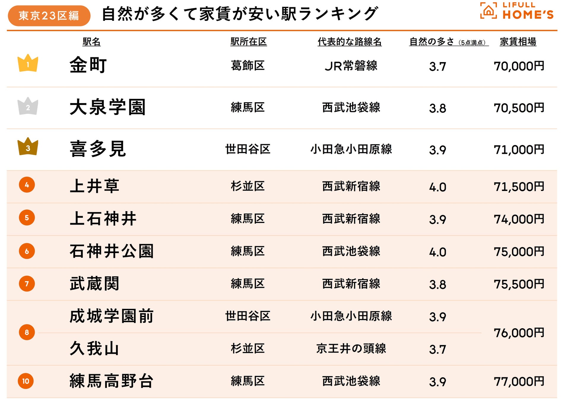 事業を通して社会課題解決に取り組む、株式会社LIFULL(ライフル)(本社:東京都千代田区、代表取締役社長:伊東祐司、東証プライム:2120、以下「LIFULL」)が運営する不動産・住宅情報サービス「LIFULL HOME'S(ライフルホームズ)」は、夏を前に、緑豊かになるこれからの時期に合わせて、東京23区における「自然が多くて家賃が安い駅ランキング」を発表します。