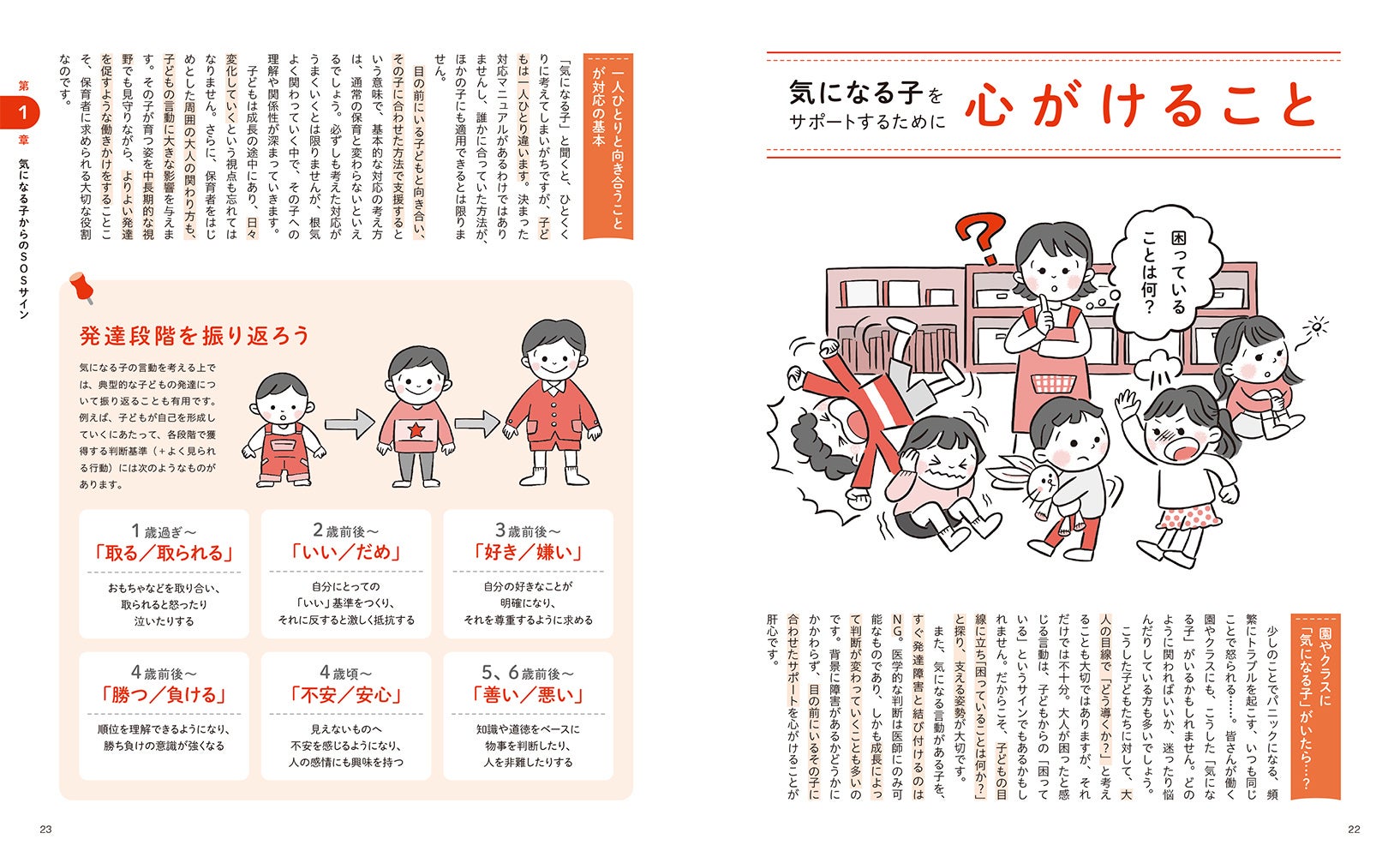 さまざまな幼稚園や保育園を巡回し、たくさんの子どもたちをみてきた公認心理士の湯汲英史さんの協力のもと、保育の現場を何度も取材を重ねて本書を制作しました。保育学生さんや新米保育士さんだけでなく、改めて「気になる子」のサポートについて考えたいベテラン保育士さんなど多くの方にぜひ手に取っていただきたい一冊です。