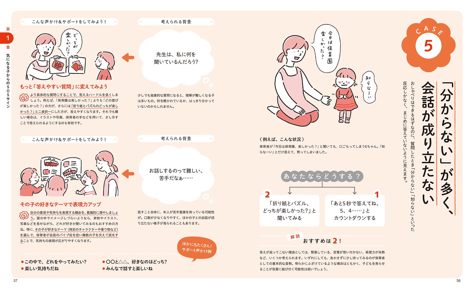 そのような気になる行動や言葉を発する子どもたちのサポート法を多数の声かけ例とともに丁寧に解説。