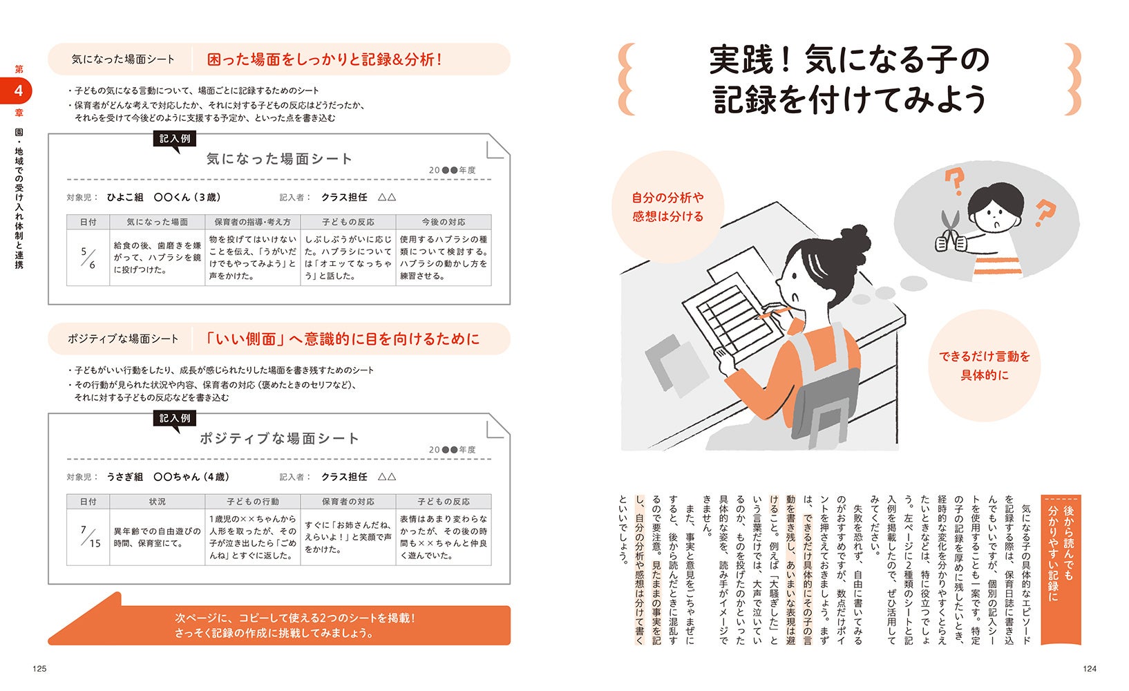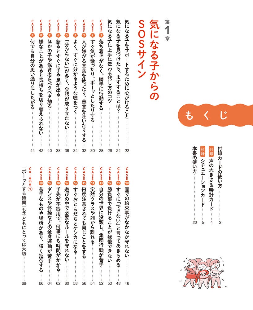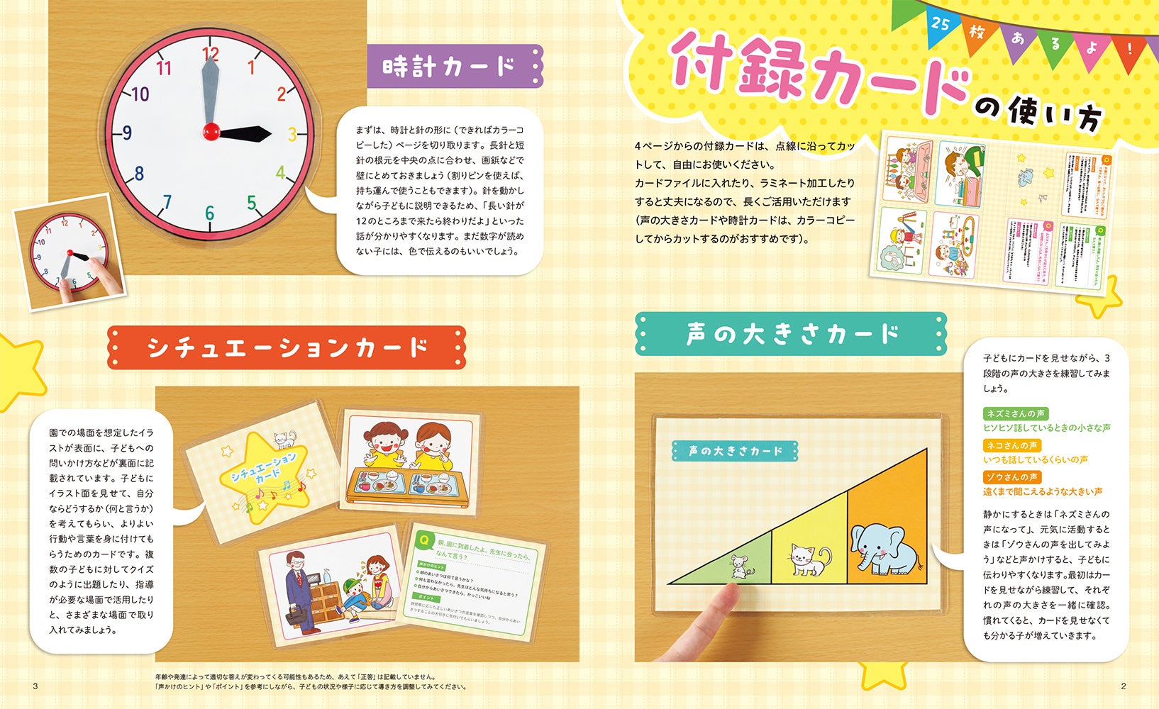 そのほか、園でのスムーズな連携の仕方や有効的な記録の取り方など、今すぐ実践したい保育で役立つ情報を豊富に収録。巻頭ページには、考えて行動する力が身につく25枚の「シチュエーションカード付き」です。