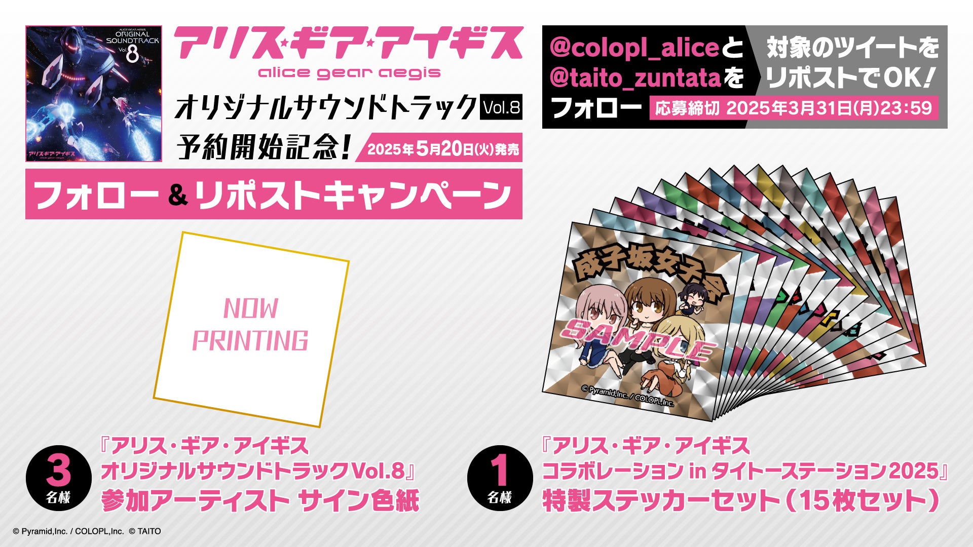 アリス・ギア・アイギス公式Xアカウント「@colopl_alice」とZUNTATA公式Xアカウント「@taito_zuntata」をフォローしてください。