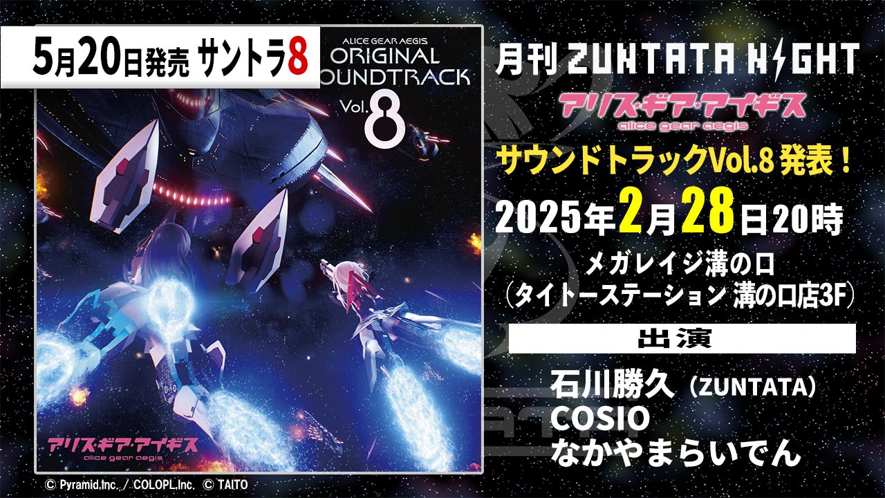 また、本日2月28日(金)20時より、本サントラの全貌を余すところなくご紹介する特集番組「月刊ZUNTATA NIGHT2月号~アリスギアOST8発表!~」をYouTube LIVEにてお届けします。