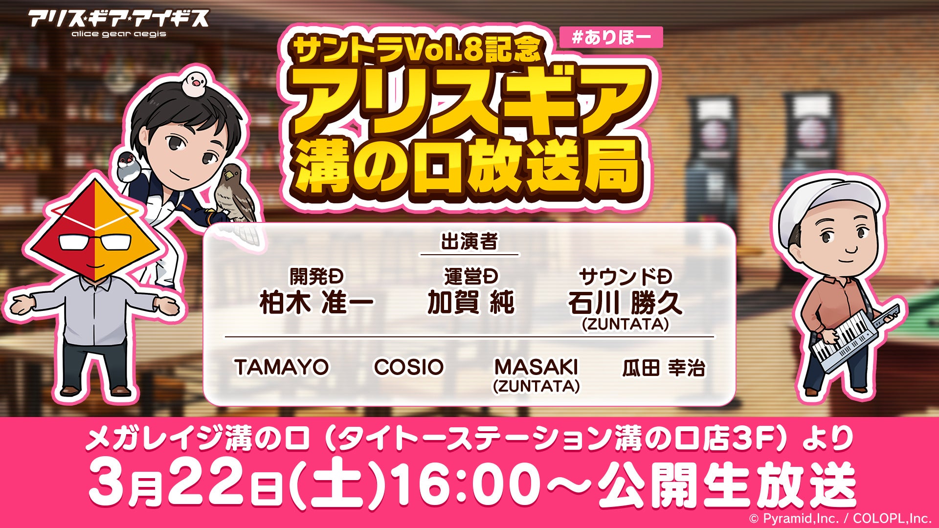 2025年3月22日(土)にはアリスギア公式YouTube番組の特別編「アリスギア溝の口放送局」をメガレイジ溝の口(タイトーステーション溝の口店3F)より公開生放送にて配信、アリスギア開発スタッフによるトークやサントラに参加したアーティストのDJライブなどをお送りいたします。