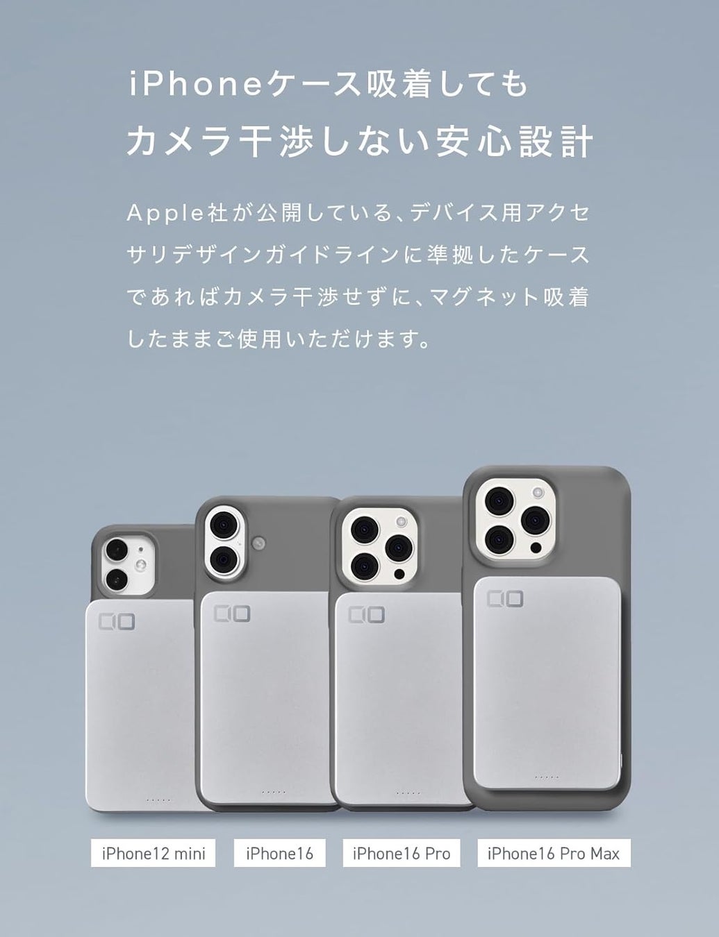 Apple社が公開している、デバイス用アクセサリデザインガイドラインに準拠したケースであればカメラ干渉せずに、マグネット吸着したままご使用いただけます。