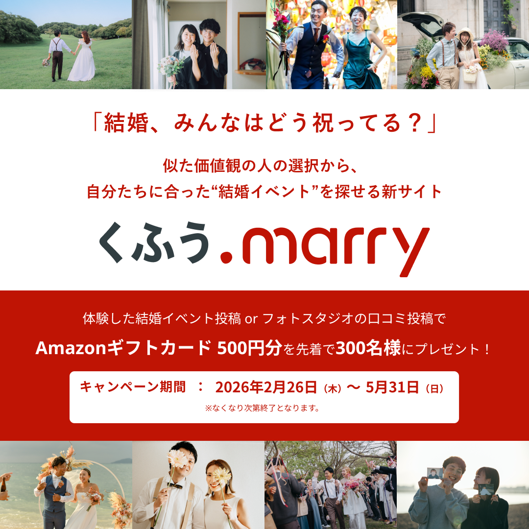 ※AmazonはAmazon.com, Inc.またはその関連会社の商標です。本キャンペーンの主催は株式会社くふうウェディングです。お問い合わせは弊社までお願いします。