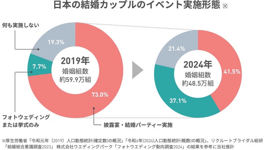 2024年の市場データでは、婚姻組数のうち披露宴や結婚パーティーを実施した割合は41.5%。2019年と比較すると大きく減少しています。
