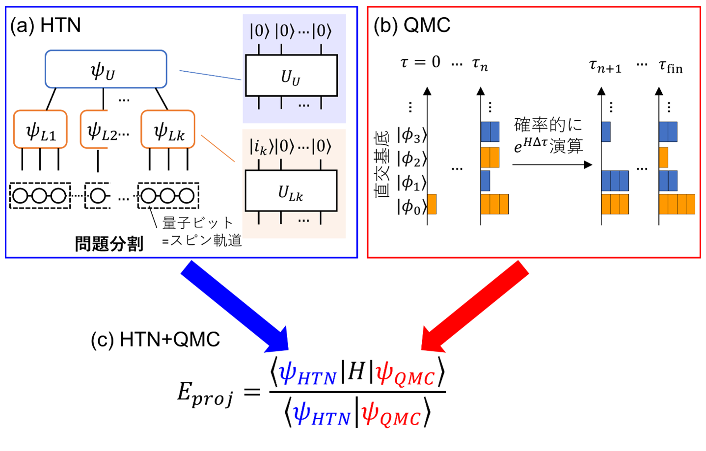 今回新たに開発した「HTN+QMC」[図2(c)]は、ハイブリッドテンソルネットワークを用いて量子状態を生成することで、量子コンピューターのサイズ以上のスピン軌道を持つ化学計算の問題に対し、量子コンピューターを用いた量子モンテカルロを実行することができる手法です。