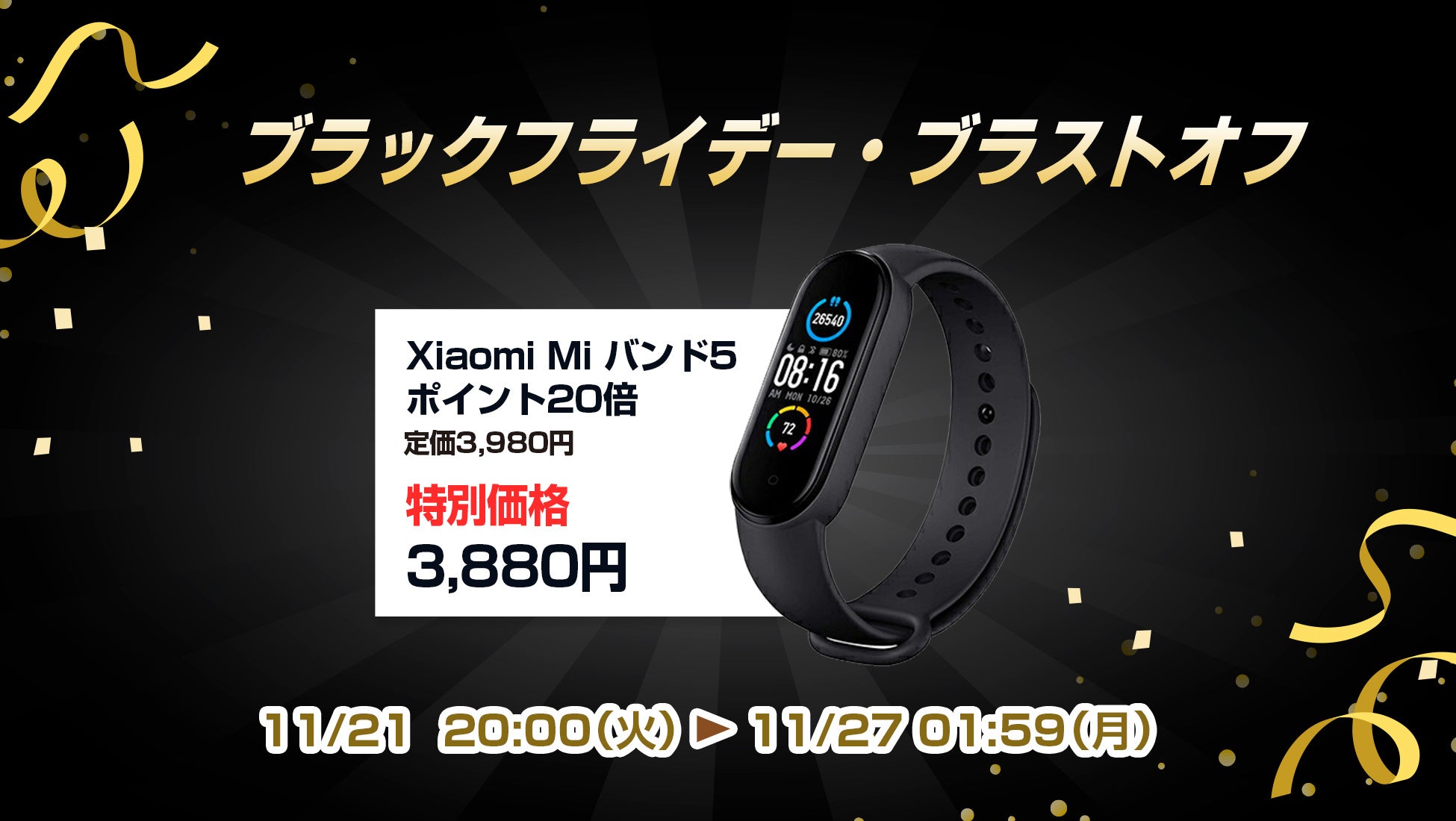 楽天「Show !t」はBLACK FRIDAY SALEを開催、シャオミMiバンド5を3,880円で販売しポイント20倍プレゼント、さらに11月21日20時開始、楽天お買い物マラソンに参加。