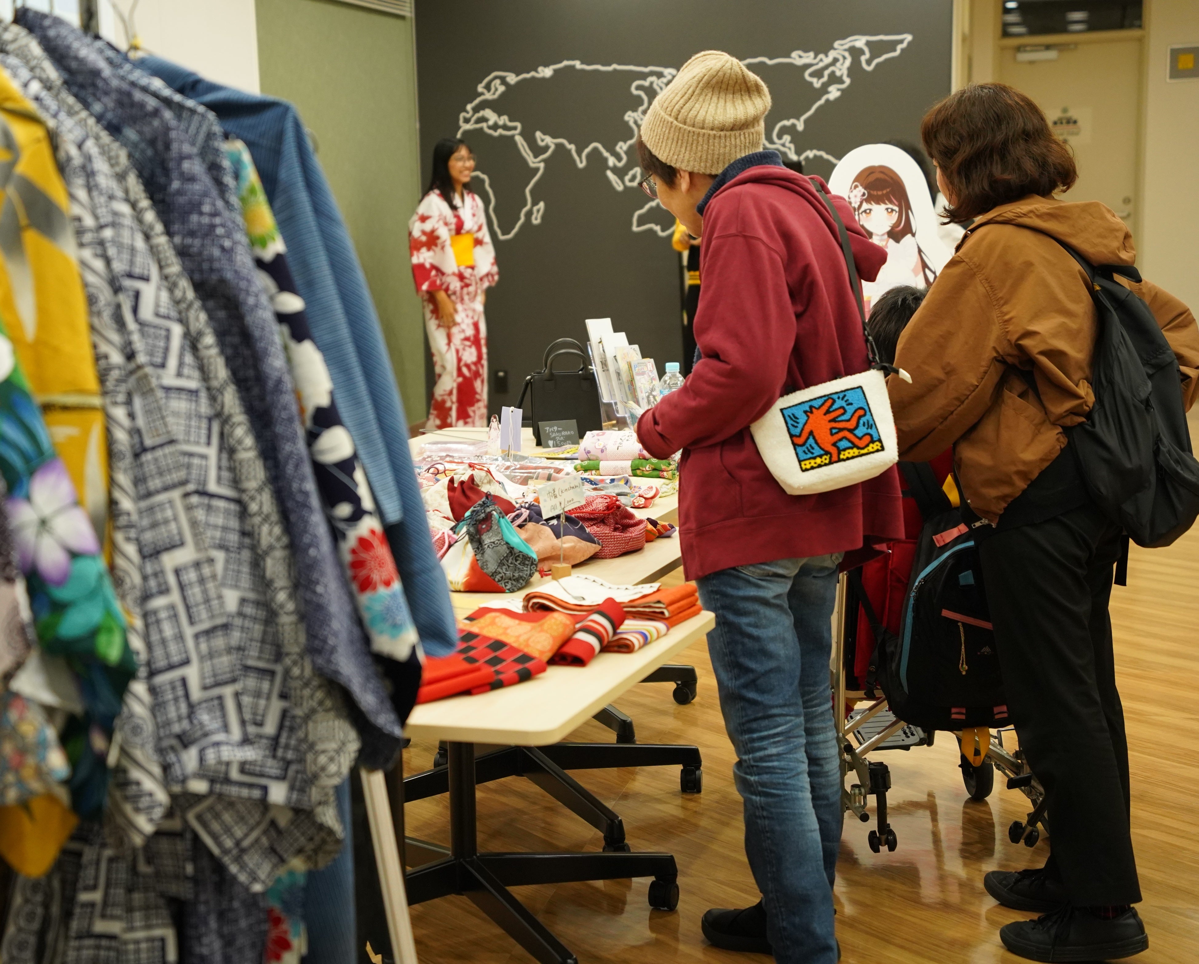 入口付近には、つぼやきカレーのキートンさんや、二重焼などのスイーツを提供するA-comキッチンさんが出店してくださいました。1階奥では、着物やバーチャルキャラクターの体験、bajraさんの本革のパンツなど、スタイリッシュな洋服も販売されました。