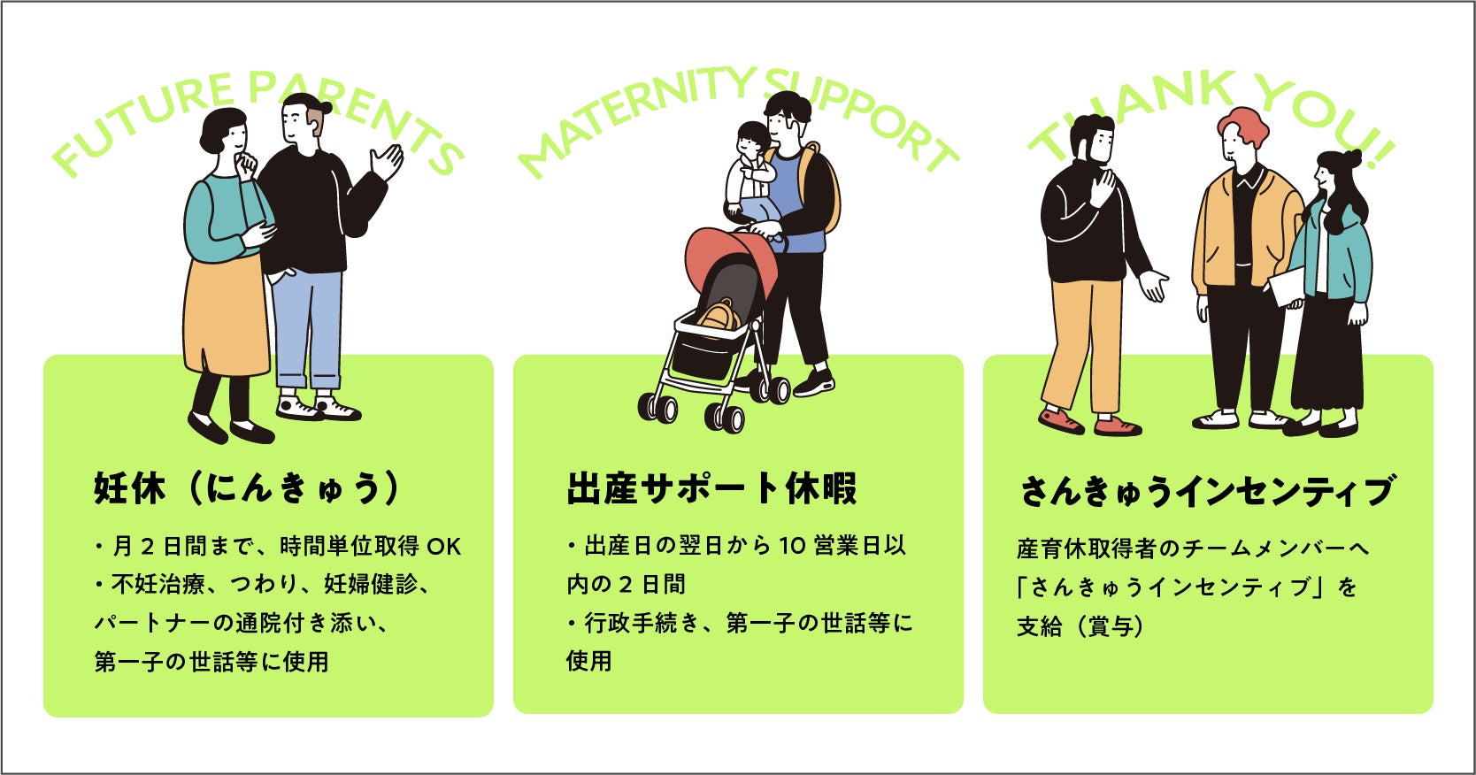 〜不妊治療やつわり、妊娠中のパートナーの通院付き添い等に使える特別休暇を導入。さらに、メンバー休業時のチームメンバーに特別賞与を支給しフォローアップ体制を推進〜