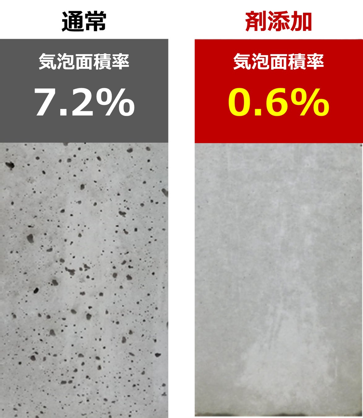 1. 独自技術を応用した特殊界面活性剤によって、コンクリート表面の美観を向上(気泡痕低減)し、表面補修作業の省力化に貢献