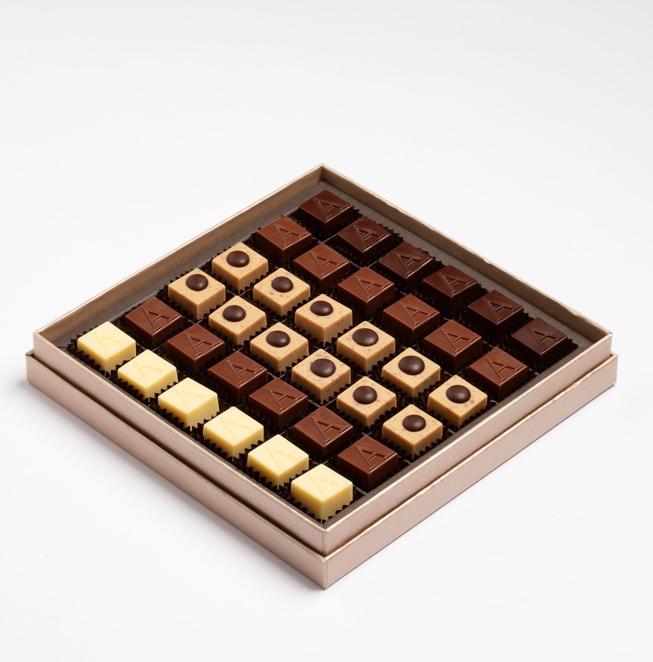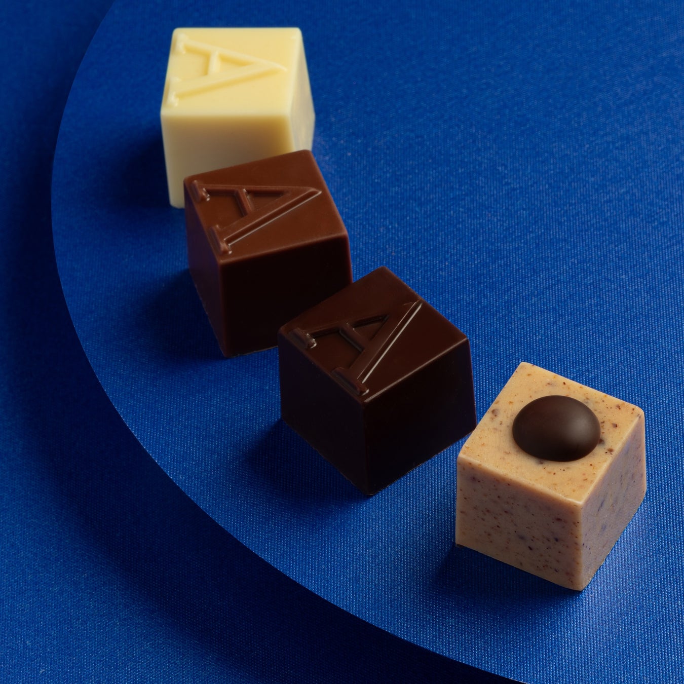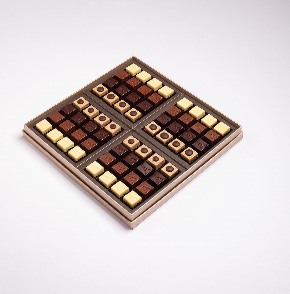サマーコレクションの限定プラリネは、ホワイトチョコレートにピーカンナッツのクランチが入り、小さなフォンダンの"ボタン"でデコレーションされています。フレーバー豊かなクラシックなチョコレートは、すべてアルコールフリーです。