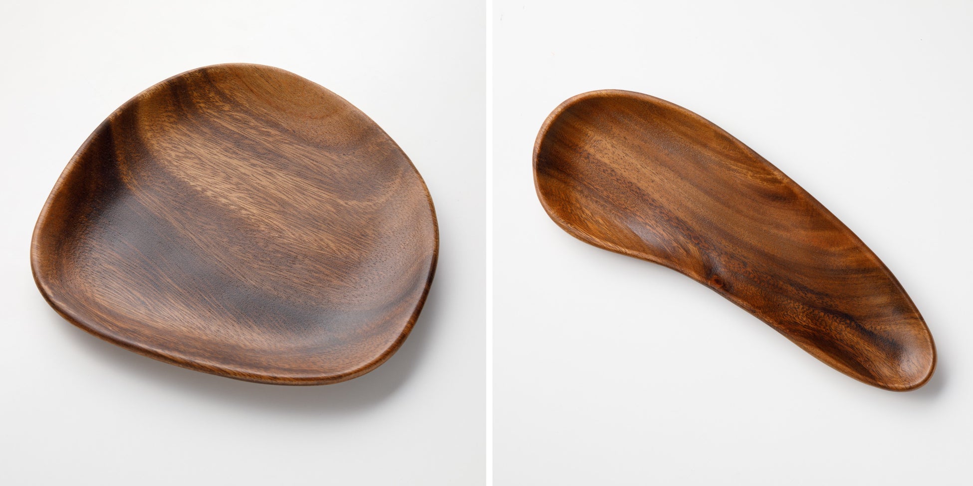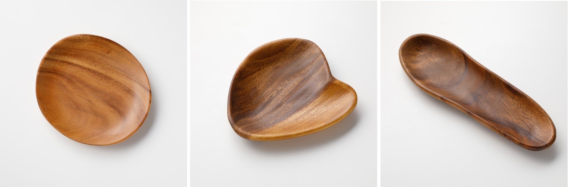この度、アカシア食器シリーズのラインアップに、曲線フォルムのプレート6種類を追加しました。ナチュラルな曲線フォルムが より天然素材感を醸し出します。細長いフォルムの食器にローストビーフを盛り付ければ、おしゃれなカフェ風に早変わり。料理だけでなく、お気に入りのアクセサリーなどを置いて棚に飾ってもかわいくておすすめです。