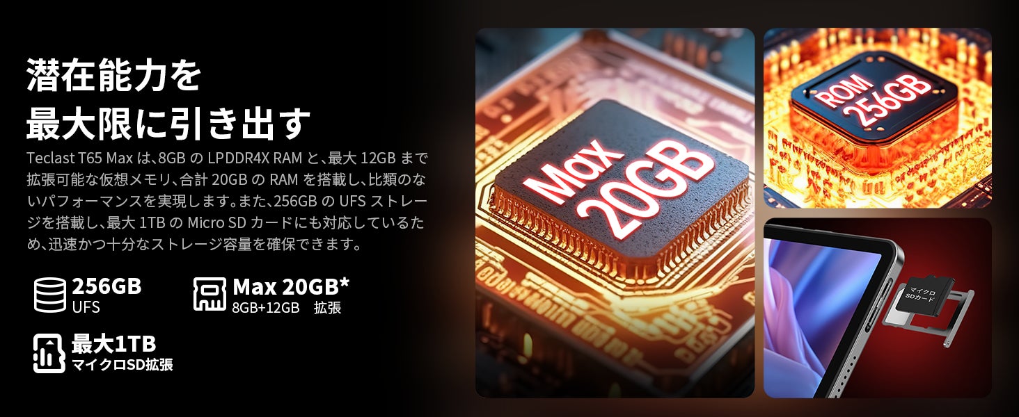 Teclast T65 Maxは、8GBのLPDDR4X RAMと、最大12GBまで拡張可能な仮想メモリ、合計20GBのRAMを搭載し、比類のないパフォーマンスを実現します。また、256GBのUFSストレージを搭載し、最大1TBのMicro SDカードにも対応しているため、迅速かつ十分なストレージ容量を確保できます。