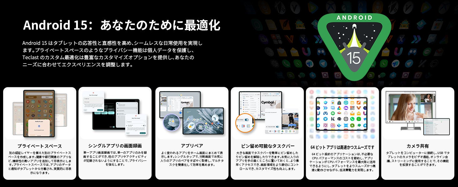 Android 15 はタブレットの応答性と直感性を高め、シームレスな日常使用を実現します。プライベートスペースのようなプライバシー機能は個人データを保護し、Teclastのカスタム最適化は豊富なカスタマイズオプションを提供し、あなたのニーズに合わせてエクスペリエンスを調整します。