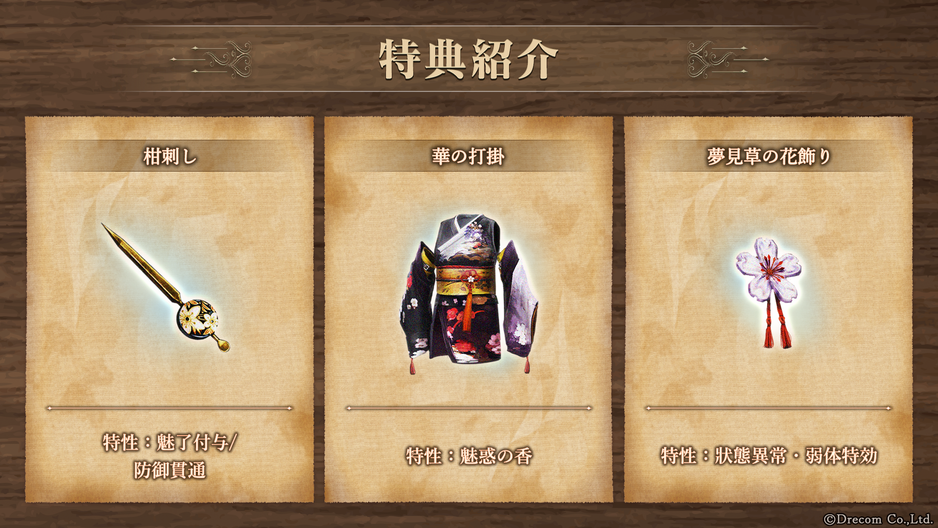 「稀なる遺骸:花街の頂点(特典付)」を逆転し、「花街の頂点 ユズナミキ」が登場した場合、特典として、抽選で装備を1つ獲得できます。
