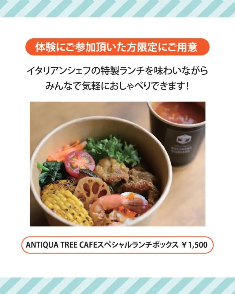 体験にご参加いただいた方には、イタリアンシェフの特製ランチ「ANTIQUE TREE CAFE スペシャルランチボックス」もご用意。お子さまと一緒に楽しいランチタイムをお過ごしいただけます。