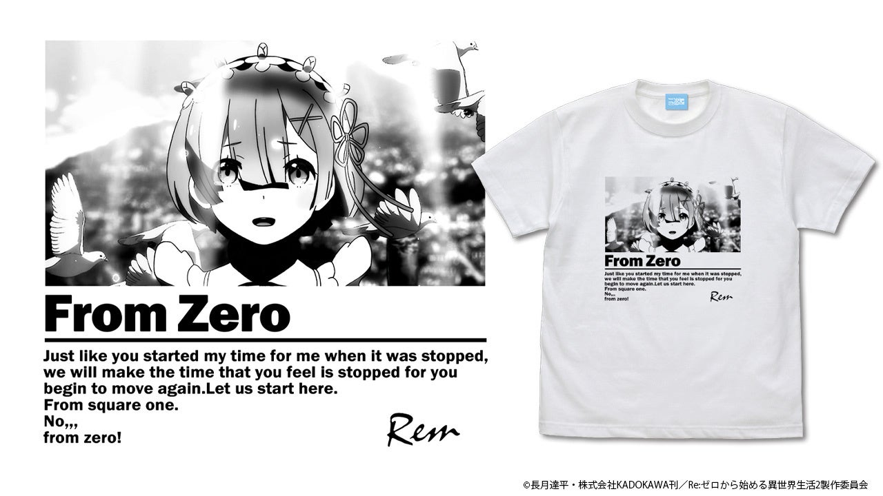 | 商品名:ゼロから グラフィック Tシャツ 価格 :¥3,300(税込) サイズ:S/M/L/XL 素材:綿100% カラー:WHITE 発売日:2023年10月中旬 <先行販売情報> 「コミックマーケット102」二次元コスパブース(西3・4ホール No.1312) 開催日:2023年8月12日(土)~13日(日) |