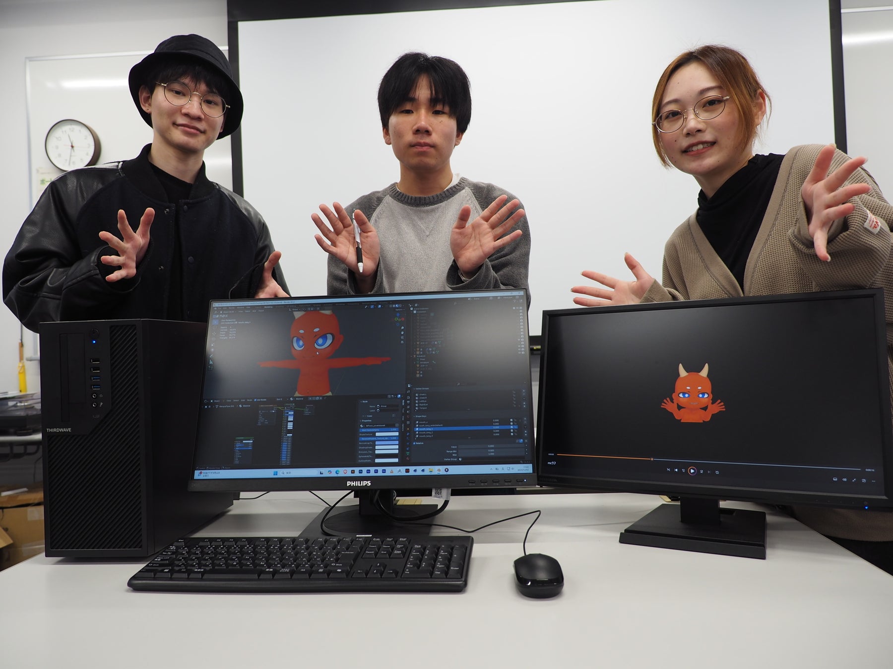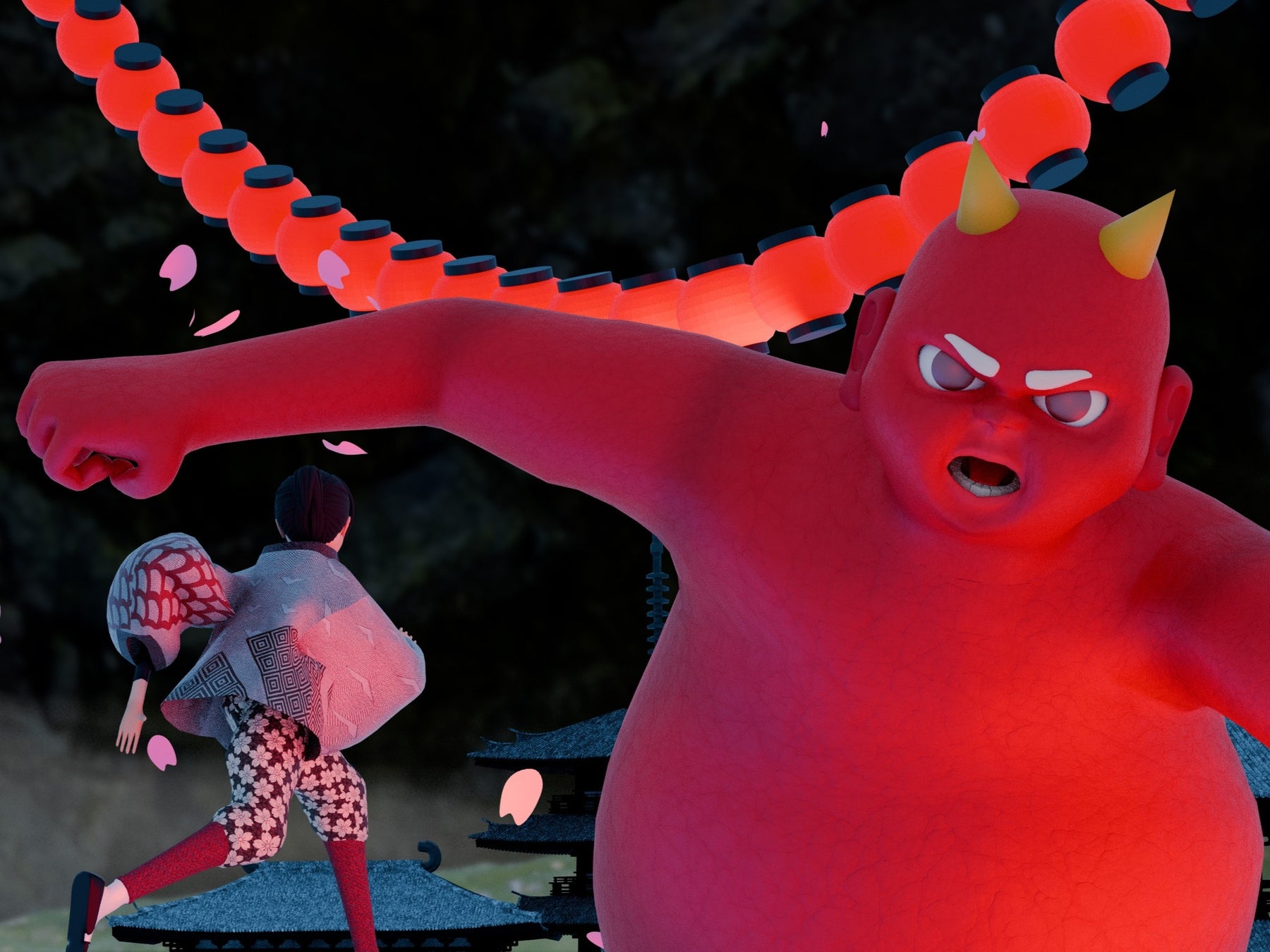 別府の温泉や自然、鬼伝承をテーマに、杉乃井ホテルと学生が共に練り上げたプロジェクションマッピング作品です。オリジナルキャラクター「ゆげまる」の案内により、鬼が守護の存在へと変わっていく物語が、建物の立体感と重なり合いながら3DCGで描かれています。学生たちは声優にも挑戦し、ヒアリングや映像表現の試行錯誤を重ねた創意工夫が、地域の魅力を温かく楽しく伝える作品となっています。