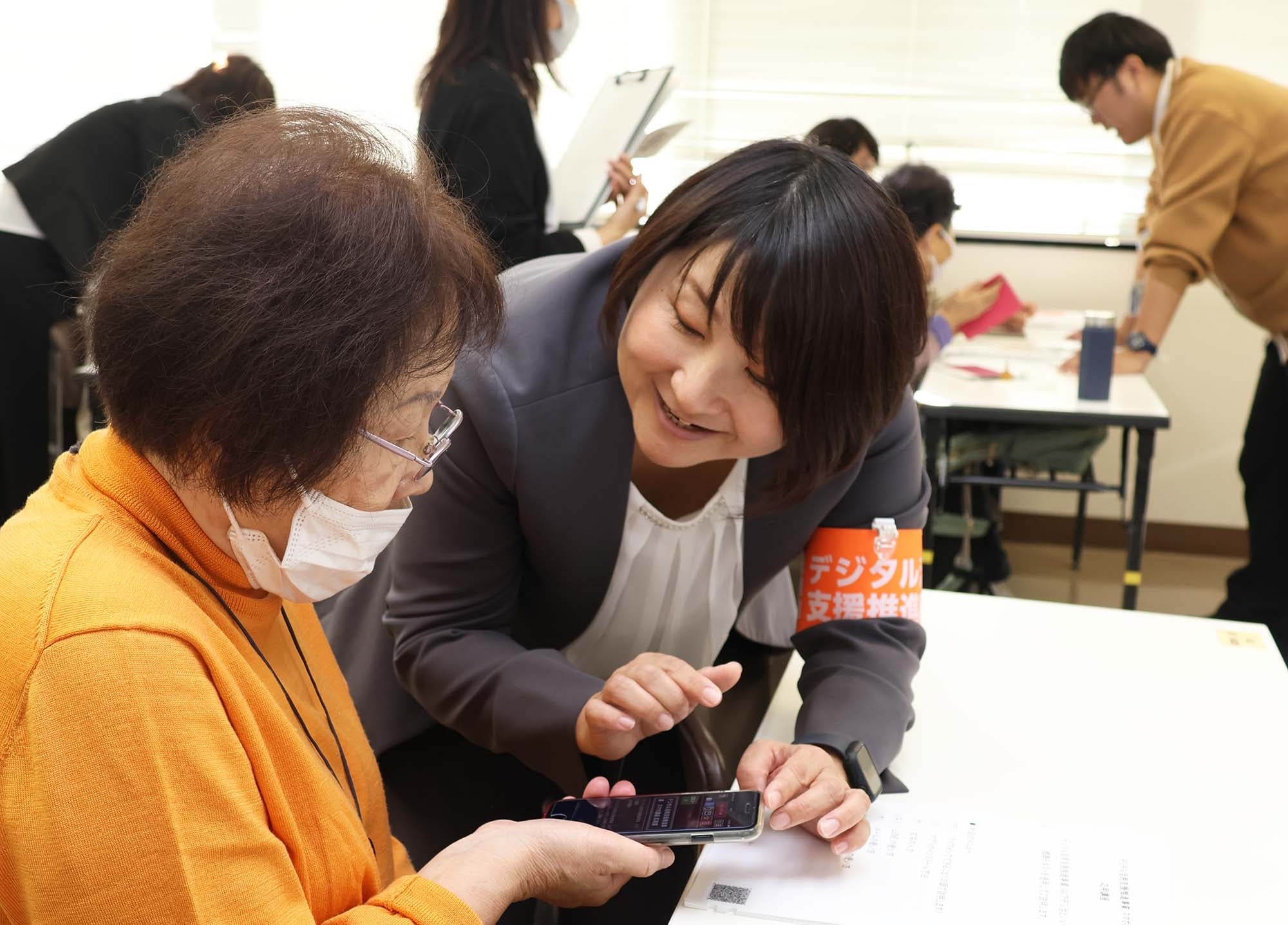 この取り組みは、障がい者や高齢者などのデジタル活用の不安解消に向けて、スマートフォンを利用したオンライン行政手続等に対する助言・相談等を行う講習会を実施することによって、「デジタル格差の解消」を図り、誰もがデジタル化の恩恵を受けられる社会を実現することを目的に総務省が実施しているデジタル活用支援推進事業を活用して開催。講座開催にあたっては、視覚障がいのある本市職員の「スマートフォンの基礎的な使用方法について充実させてほしい」「あると便利なアプリを紹介してほしい」などの意見を取り入れるなど同社と共同で、音声読み上げ機能アプリに対応した教材を作成。「見て使う」以外のスマホの便利な使い方について、後から見返した時にも理解し易いよう、操作方法を細かく掲載しました。この日は、デジタルデバイド解消のために同社で情報リテラシーアドバイザーを務める粟津千草さんとスマホ教室の講師経験がある黒川季里子さんをはじめとしたスタッフらによって、講座を実施。まず、iPhoneを使って、サポートを受けながら音声読み上げ機能アプリを活用し、テキストを確認しました。その後、参加者はSiriの使い方、文字の入力方法などを学びながら、スタッフからSiriに話しかける時はハッキリと言葉を話すことやスムーズに画面を遷移させるために3本指を使用することなど操作上のアドバイスを受けながら真剣に取り組みました。参加した人たちは、「習得した機能を早速使ってみたい」「便利な機能をたくさん教えてもらってとても助かった。これからの生活に役立ちそう」と感想を話していました。