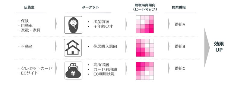 具体的には、性年代や趣味嗜好などの統計データを持つドコモデータおよびインテージデータと、TFMが保有する「radiko」のユーザーIDを大規模DMP※4「di-PiNK®」を用いて突合し、広告主のターゲットとなり得るセグメントごとに聴取分布(ヒートマップ)を作成、およびユーザーのプロファイルを可視化することで、各ラジオ番組のリスナーの属性や消費動向などの情報を把握します※5。セグメントは、性年代などの属性情報、ライフイベント、購入意欲・趣味嗜好などドコモやインテージが持つ多様なデータから設定可能です。これにより、リスナー属性に基づいた効率的なプランニングができ、ラジオ広告の費用対効果を最大化することが可能です。さらに、KPIに応じて広告出稿後のブランドリフト調査※6なども実施することで、ラジオ広告の費用対効果を数値化することも可能です。