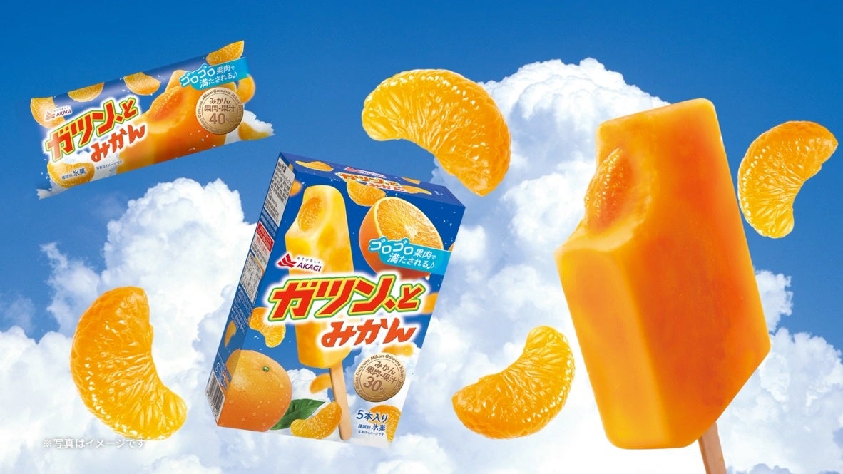 「ガツン、とみかん」は、みかんアイスキャンディーに、みかん果肉をガツン、と詰め込んだ仕様です。ゴロゴロ果肉で満たされる贅沢な果実体験を、どうぞお楽しみください♪