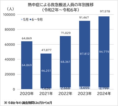 近年の猛暑の影響により、熱中症患者数は増加しています。総務省が発表した「令和6年5月から9月の全国における熱中症による救急搬送状況」の報告によると、令和5年度の救急搬送人員の累計は97,578人であり、平成20年の調査開始以降、最も多い搬送人員数となりました※1。