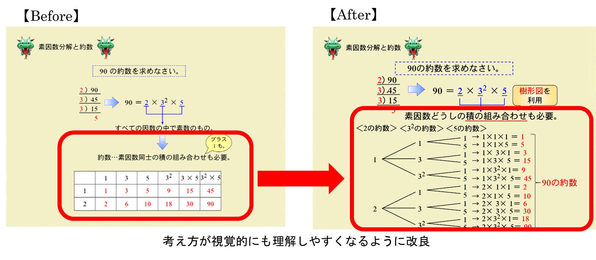 中学数学の学習単元である「素因数分解」は、約数を求める際にも必要となる知識です。約数は因数どうしの積の組み合わせを使って求めますが、組み合わせの求め方をより視覚的にわかりやすくできないかというご要望を受けて、この度全面的に変更を行いました。