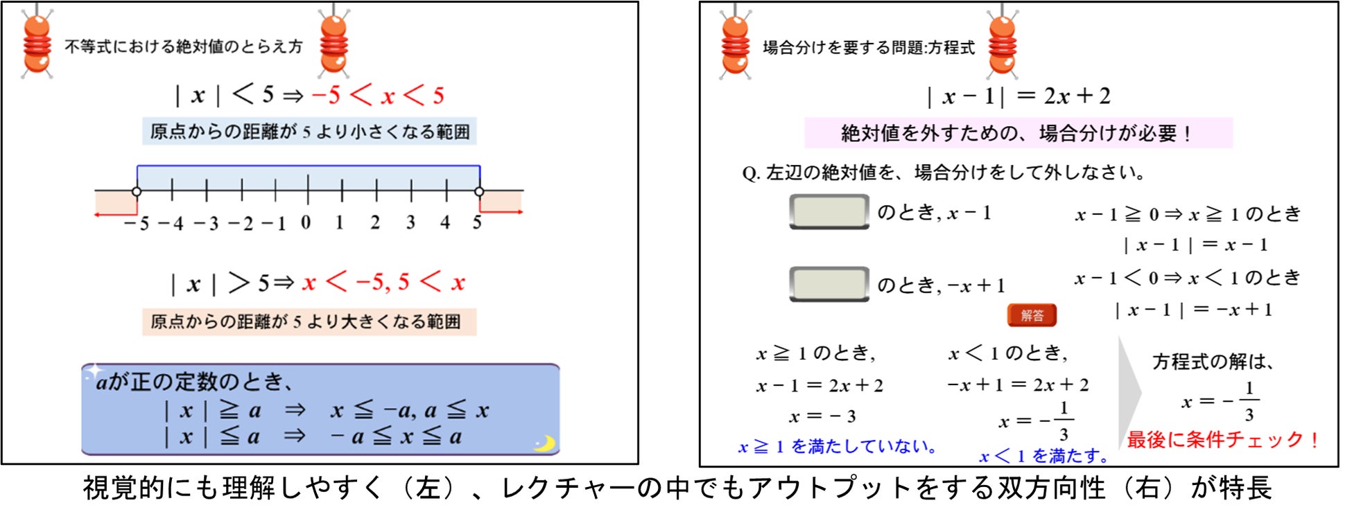 高校数学Ⅰの「絶対値」を含む方程式や不等式の解法は、多くの学生にとって難易度の高い分野で、一部教科書以外は本編での取り扱いがされていません。今回のアップデートでは、発展的な内容として学習させたいという先生方からのご要望にお応えし、新たに追加しました。従来同様に、スモールステップでの展開と、インタラクティブなレクチャーにより、生徒が確実に理解し活用できるようにサポートします。