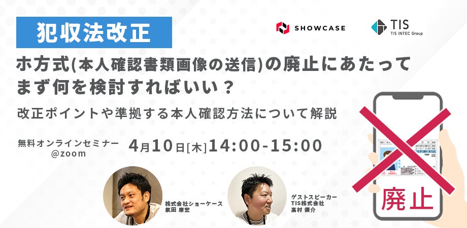企業と顧客をつなぐDXクラウドサービスを展開する株式会社ショーケース(東京都港区、代表取締役社長:平野井順一、証券コード:3909、以下ショーケース)は、4月10日(木)14:00〜「【犯収法改正】ホ方式(本人確認書類画像の送信方式)の廃止にあたってまず何を検討すればいい?」と題したセミナーをオンラインにて開催いたします。