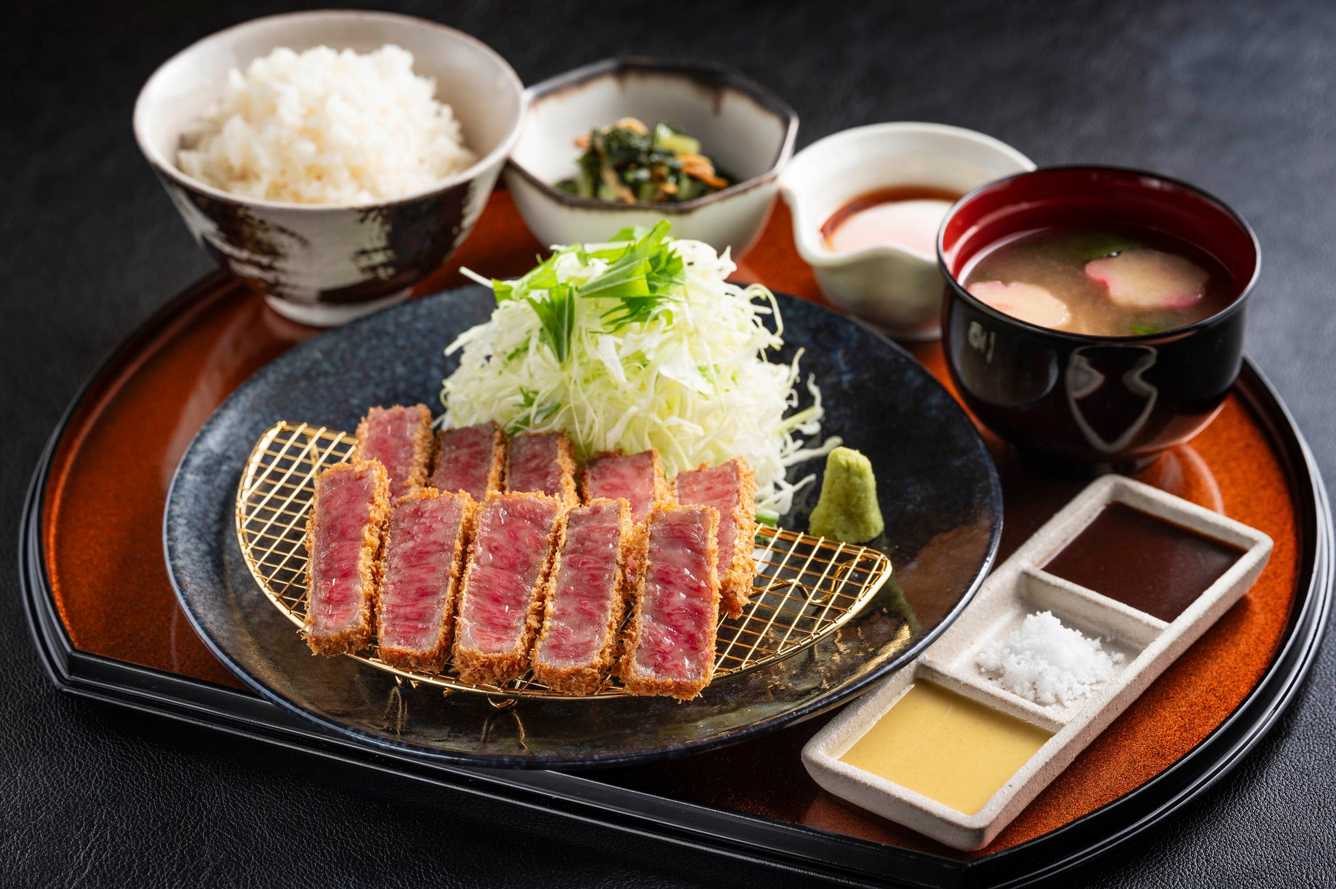 こだわりの牛カツ。赤身肉の美味しさをご堪能いただけるようレア感を残しながら、表面はサクッと、中身はジューシーに揚げた牛カツです。牛カツのサイズはお選びいただけます。