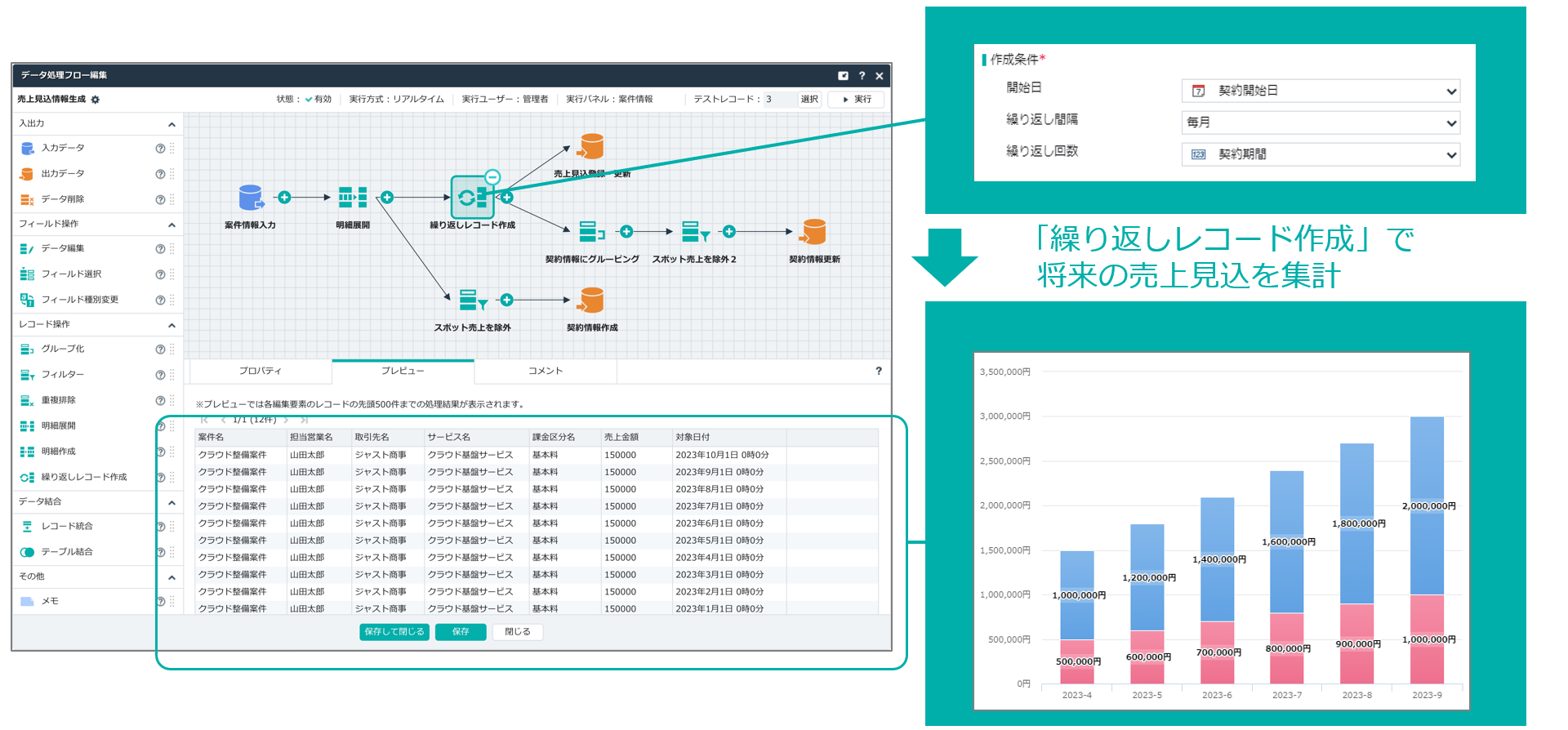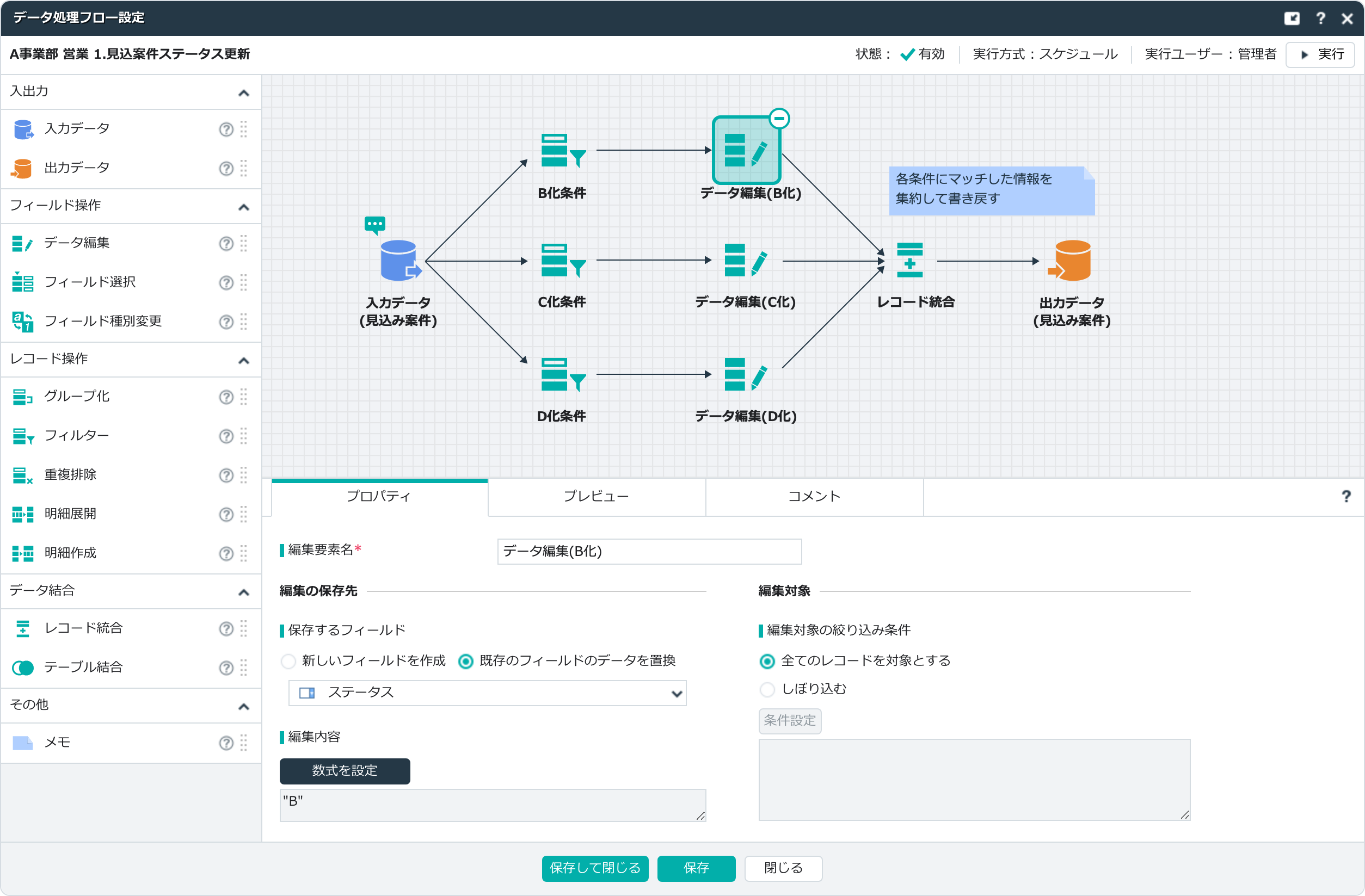 ■「データ処理フロー」機能により、案件ステータスの変化や、活動状況の分析が容易に